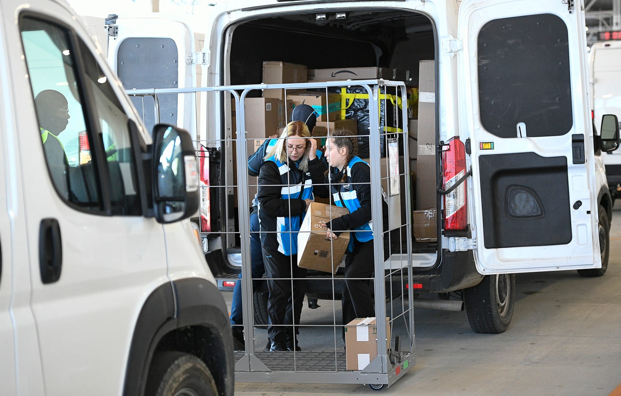 Goods arrive, usually after dark, at the rear docks from Amazon’s fulfillment center in Greensboro, North Carolina. Starting about 2:30 a.m., crews begin efforts to group the incoming packages by route. Everything goes into a square bag and onto a rolling rack. Racks are staged in long rows. In subsequent steps, workers roll the carts to waiting delivery vehicles that have pulled up outside the plant. The vehicles include large white vans, all gas-powered at this point, and drivers’ own cars and trucks. Amazon has set goals to expand its use of electric vehicles, said Jon Greeley, head of economic development in Virginia for Amazon.