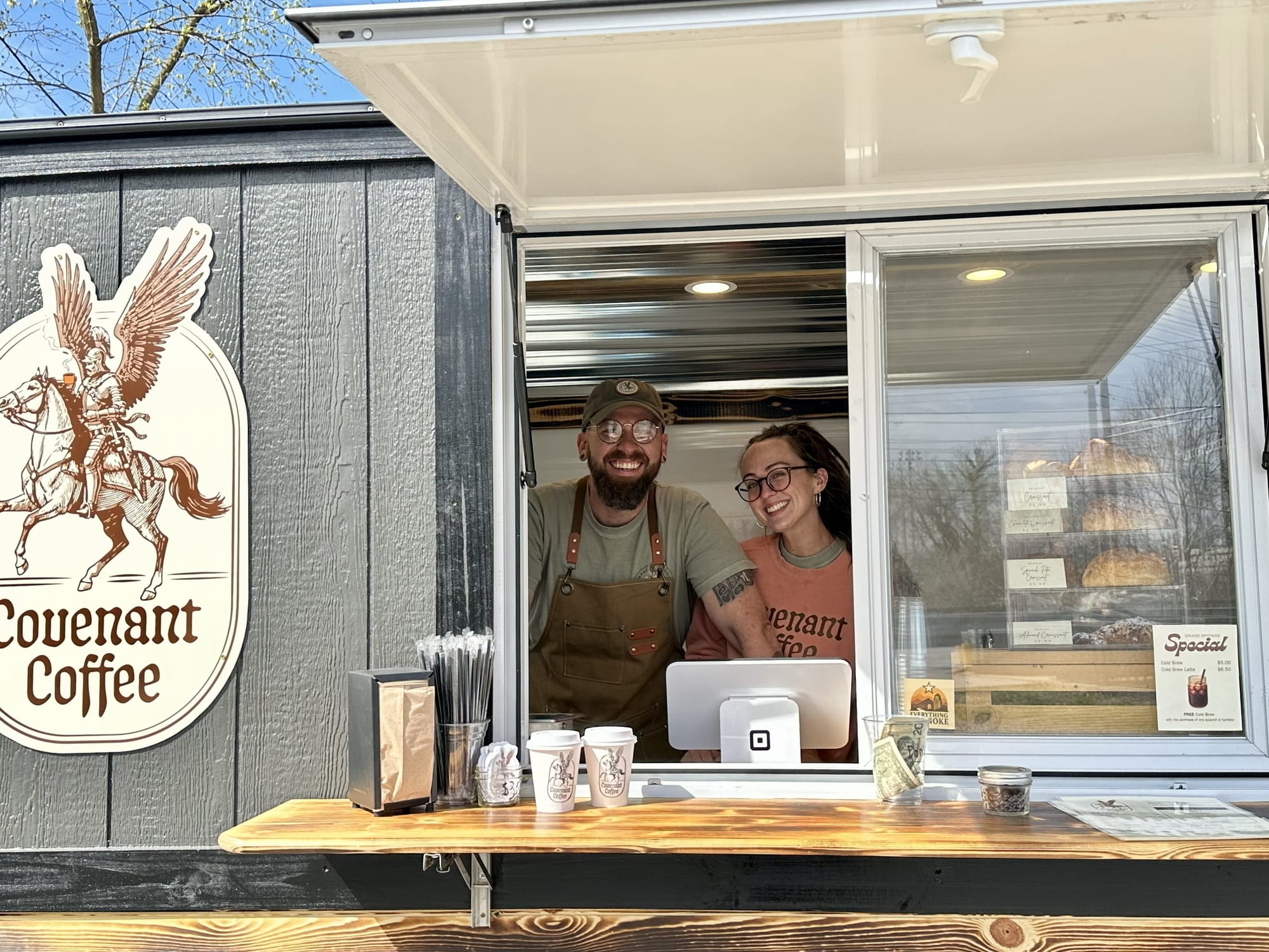 On March 14, my daughter and I stopped by Covenant Coffee Company to check out the coffee trailer’s grand opening at 1911 Franklin Rd SW. It was a sunny, crisp spring morning, and the trailer and brand logo were gleaming with an inviting allure. Behind the window, owners Jeff Baxter and his wife, Meredith, were all smiles and teeming with new business owner energy. Baxter predicted I would order a honey lavender latte; I was impressed that he remembered it was one of my favorite flavors, but pointed out that during our February interview, he’d said that a cappuccino is his litmus test for evaluating coffee shops contending for repeat customer status.