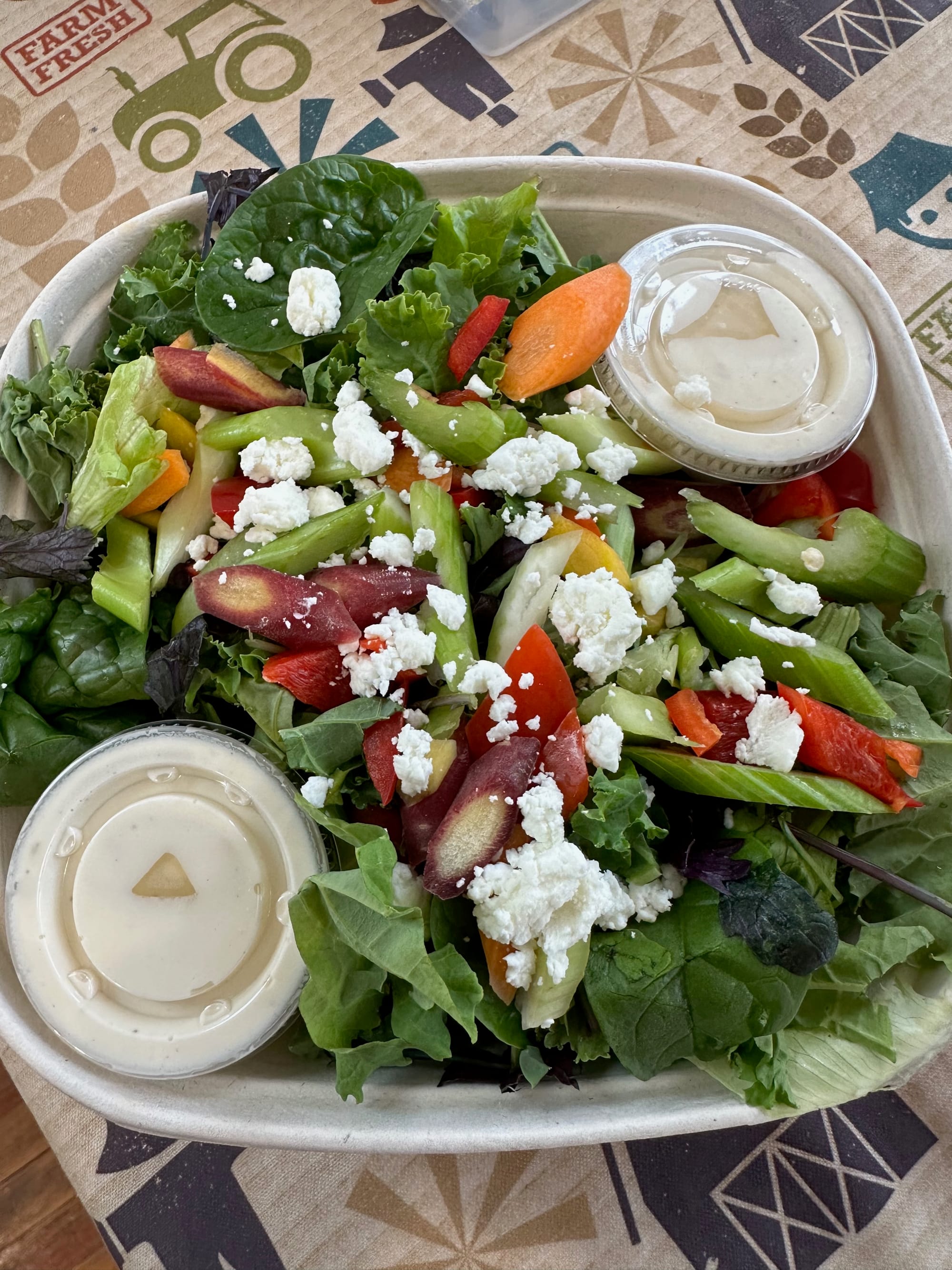 If you have time to order ahead, I love the Greekish salad ($12; $18 with chicken) at Bobby’s Hot & Cheesy in the Towers Shopping Center (2071 Colonial Ave. SW, Roanoke). A bed of fresh greens is topped with tomatoes, roasted red peppers, kalamata olives, feta cheese crumbles and an ample scattering of pickled red onions (a plus in my book) and served with balsamic vinaigrette.