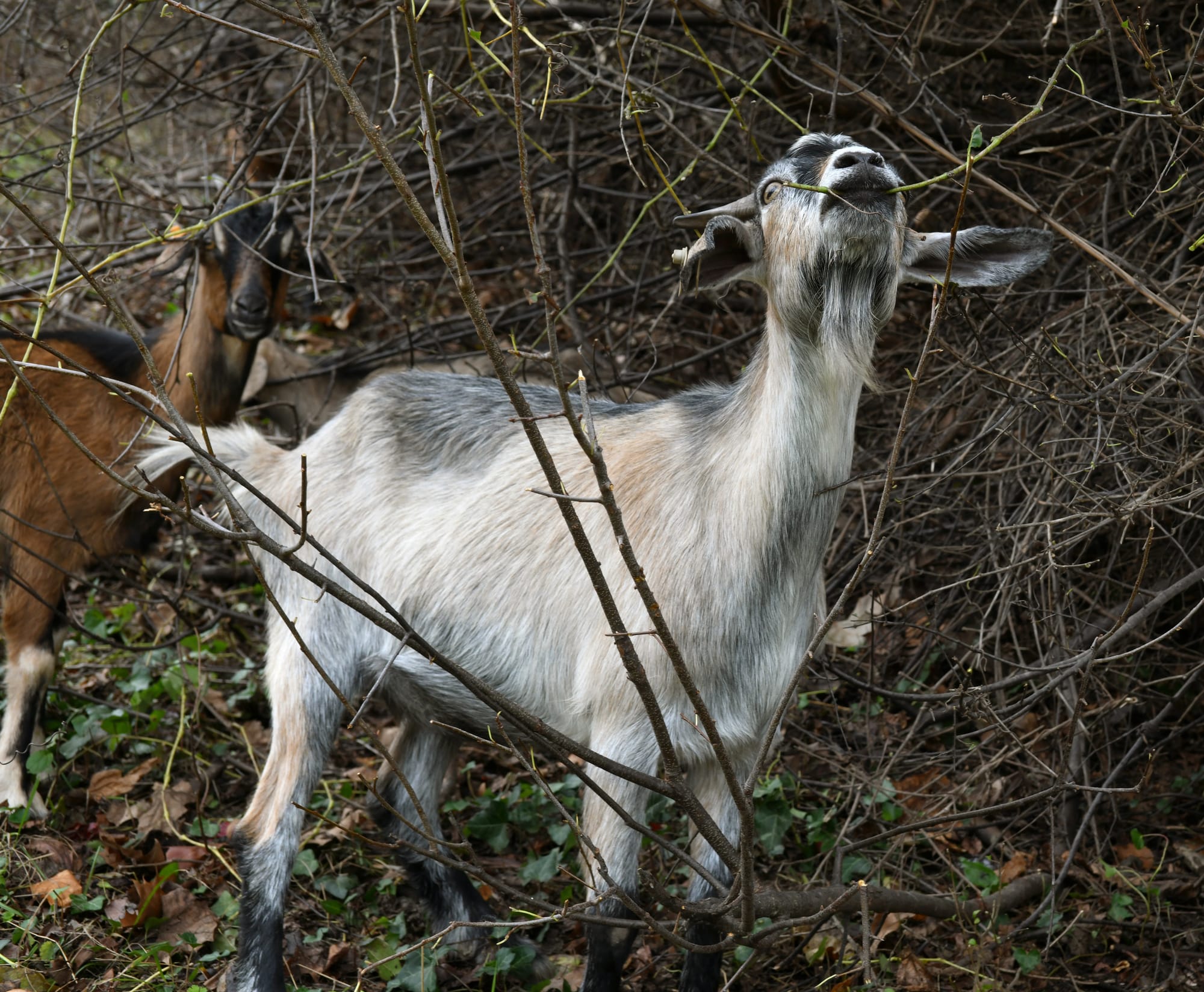 On Monday, one of Reed’s goats, Bingles, was the obvious leader of the pack. He shoved up a tree branch so the other members of the team could eat underneath it. Then Bingles did a little hamming for a photographer’s camera.