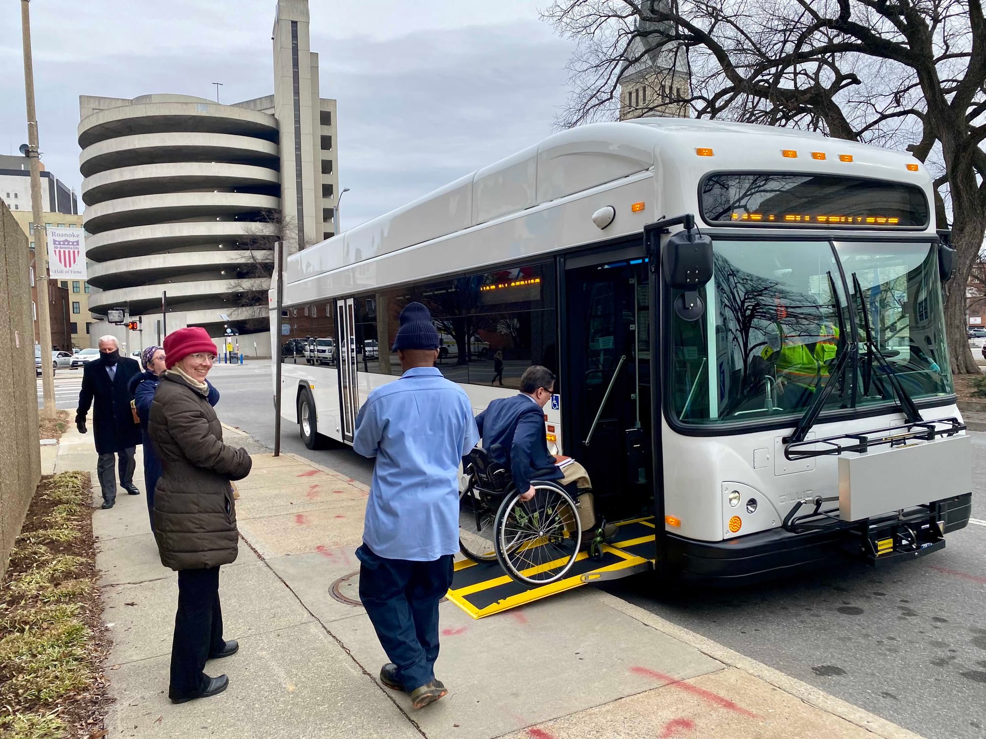 An electric bus glided around the municipal building Tuesday as city leaders celebrated a Roanoke first.