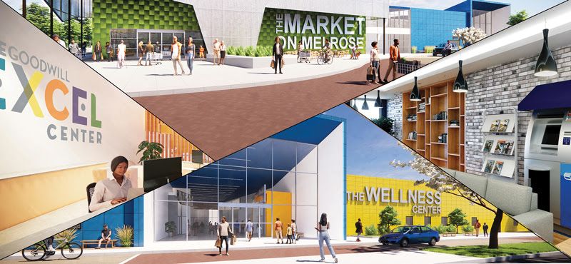 Called Melrose Plaza, the facility will be anchored by a full-service grocery store, and include a banking center, health clinic and free high school for adults.