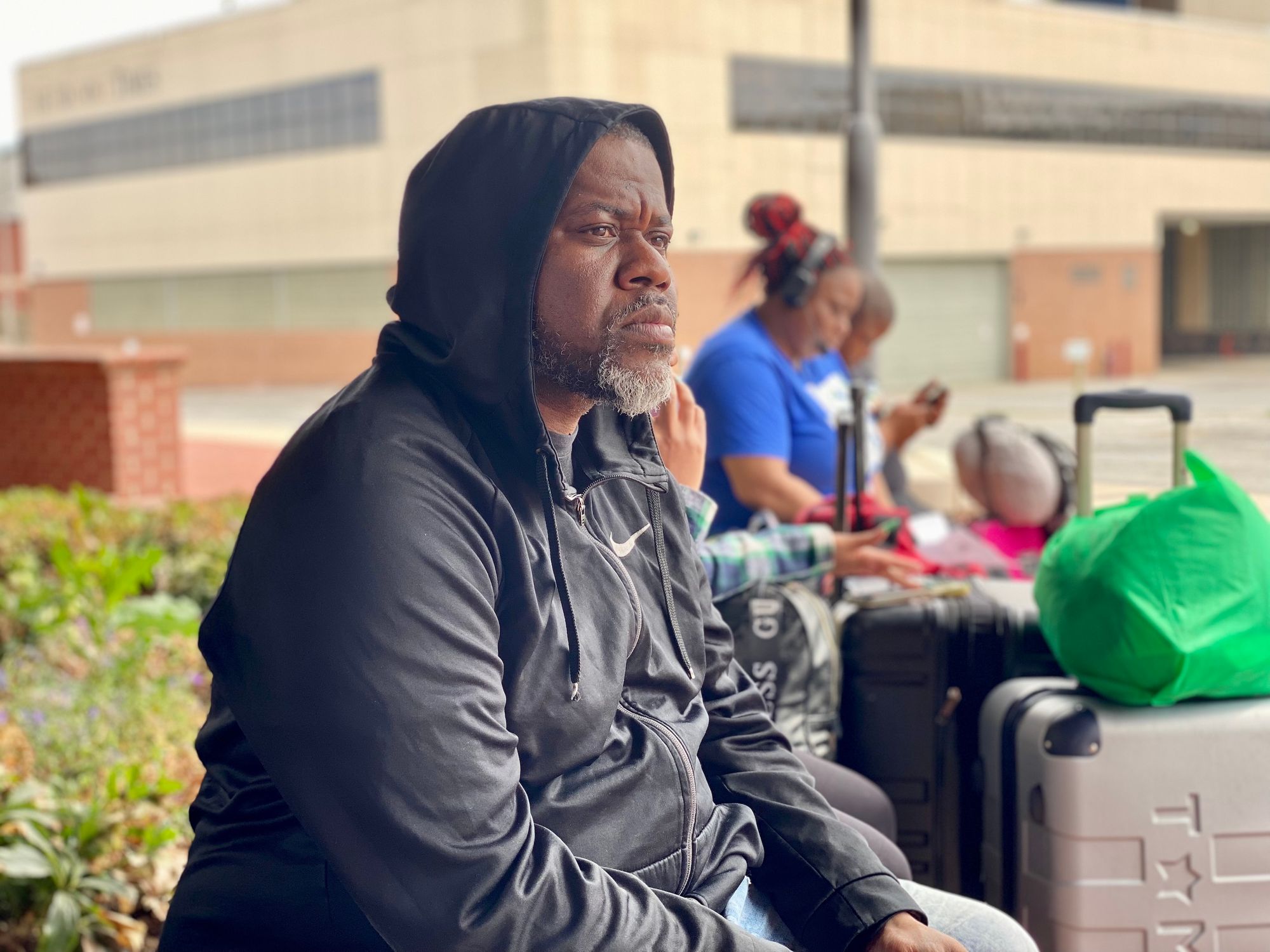 Greyhound passengers with luggage wait for hours in front of the museum.