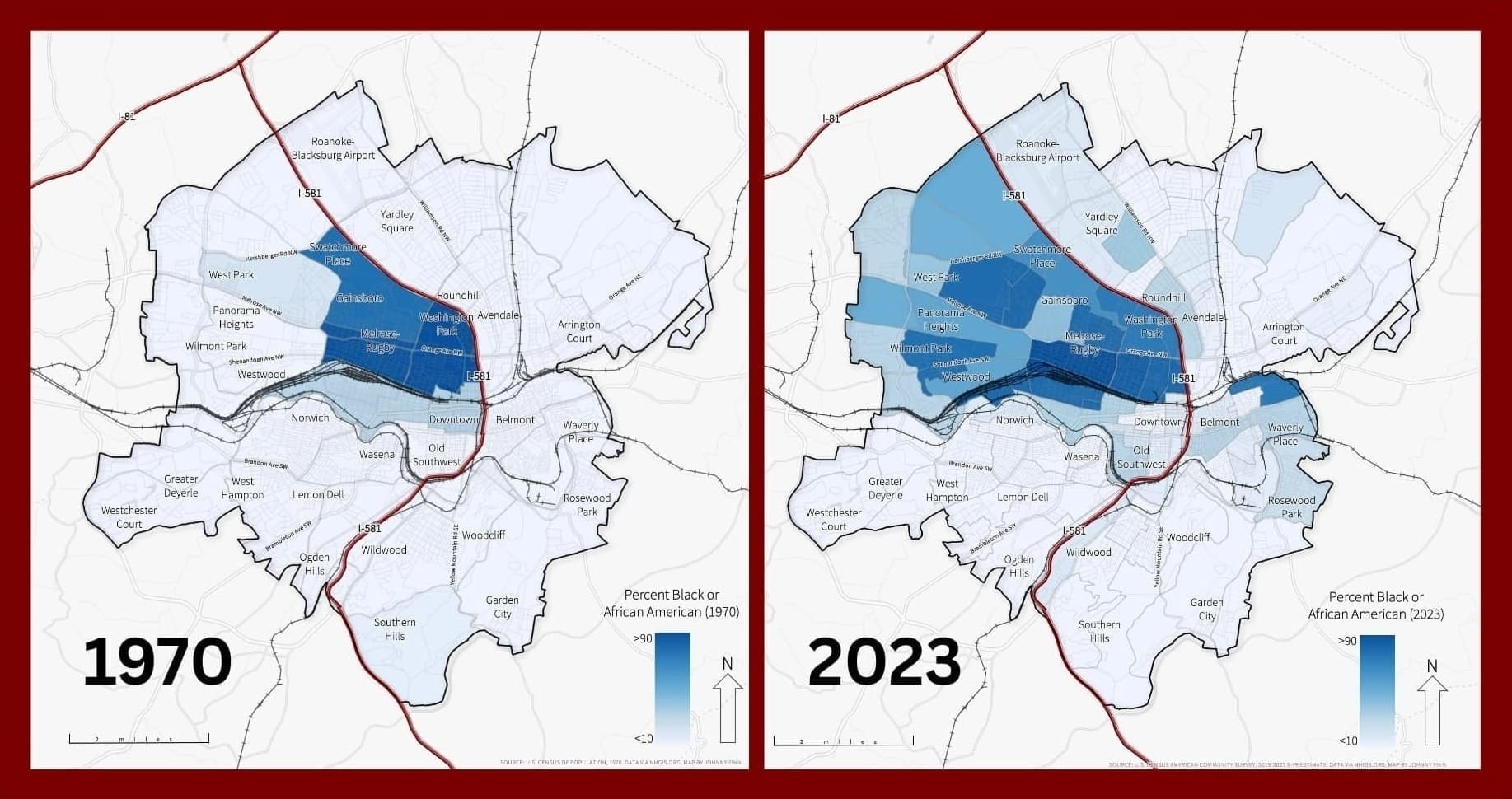 Segregation in Roanoke: 1970 (left) vs. 2023 (right)