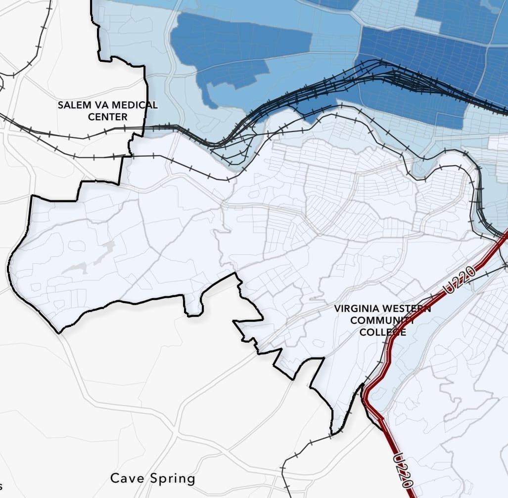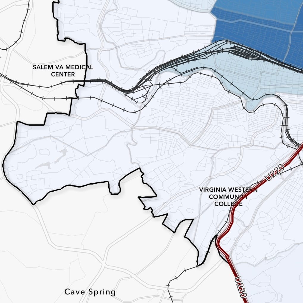 In Roanoke, city leaders routed the highway directly through historically Black neighborhoods in Northeast Roanoke, displacing residents and reshaping the city’s racial geography. The 1970 map shows the aftermath of urban renewal, with nearly the entirety of Roanoke’s Black community forced west of the newly constructed highway.