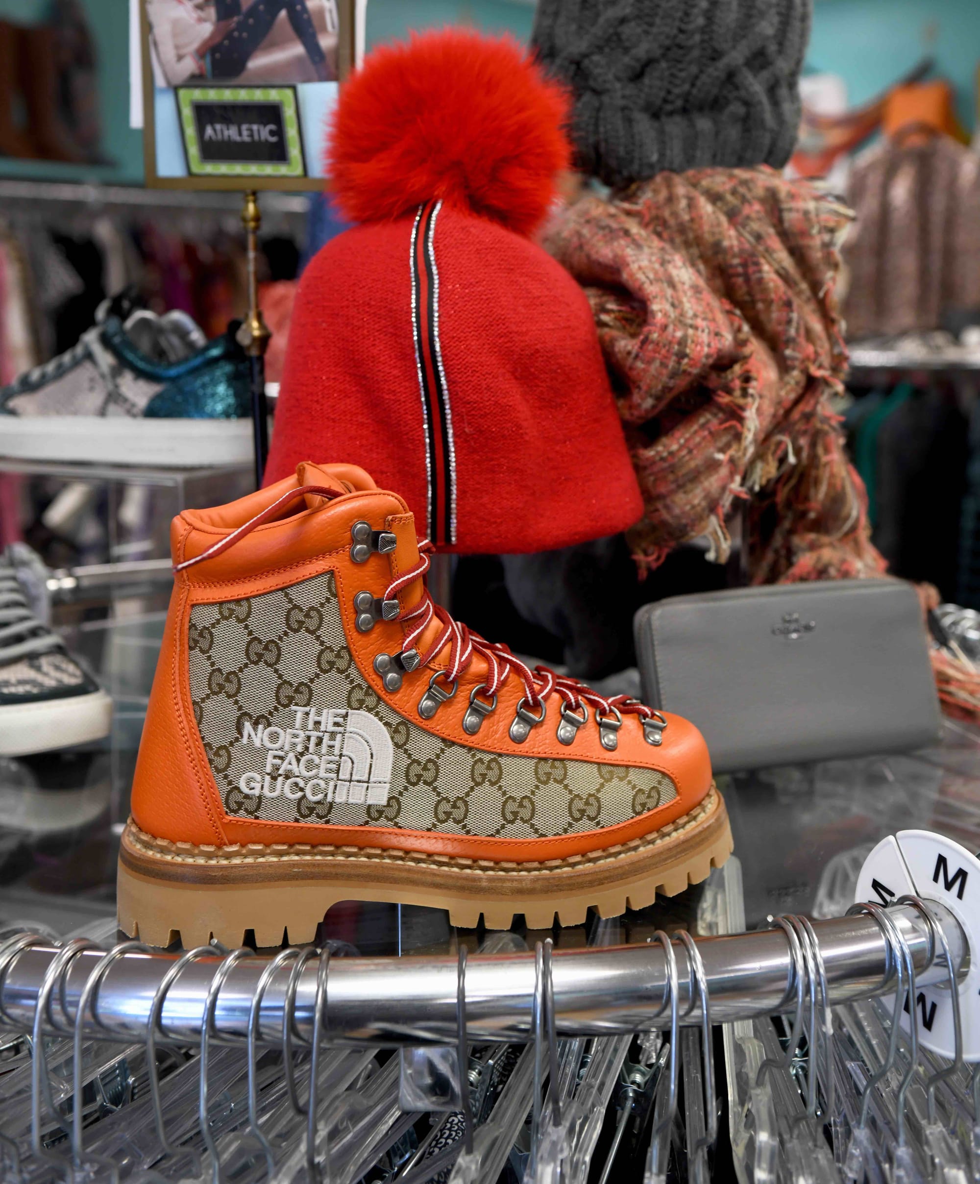 In the shop, accessories run floor to ceiling, with circular center garment racks providing focal points for unique displays, color pops and the inevitable Chanel or Louis Vuitton logo. Even limited collaborations like the blazing orange, monogrammed boots from The North Face x Gucci drop in 2024 are on display.